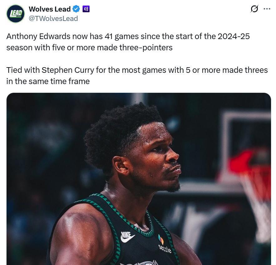 本赛季爱德华兹延续这一表现,本场再度命中5记三分后,近2个赛季已经41次单场命中至少5记三分,成功追平历史三分王库里并列同期联盟第一。